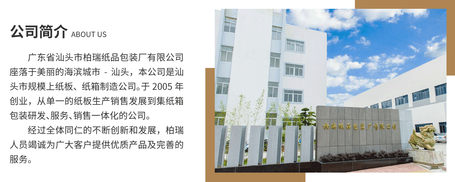 • 广东省汕头市柏瑞纸品包装厂有限公司座落于美丽的海滨城市-汕头,本公司是汕头市规模上纸板、纸箱制造公司。